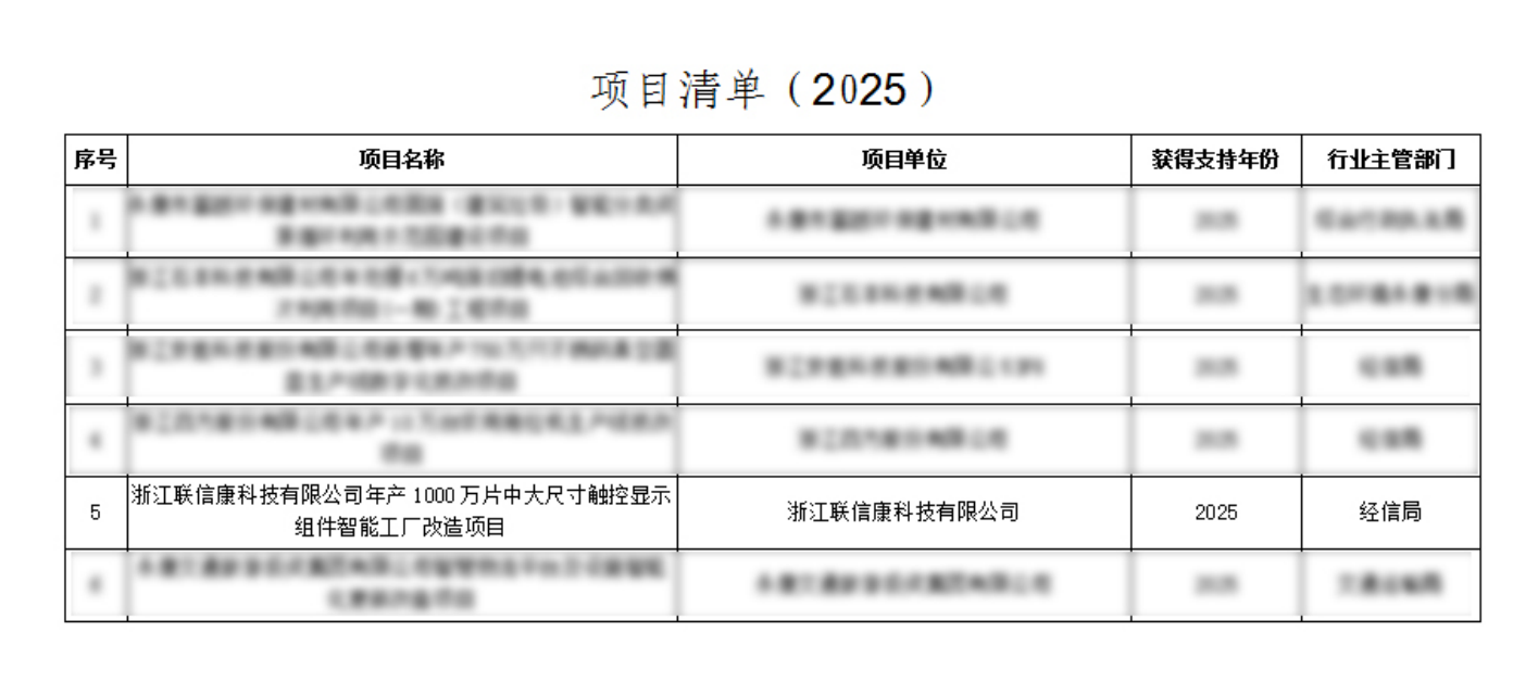 近日,浙江联信康科技有限公司报送的“年产1000万片中大尺寸触控显示模组智能工厂改造项目”成功入选2025年度《工业重点行业领域设备更新和技术改造》“两新”项目支持计划,并获得专项资金支持共计1031万元。